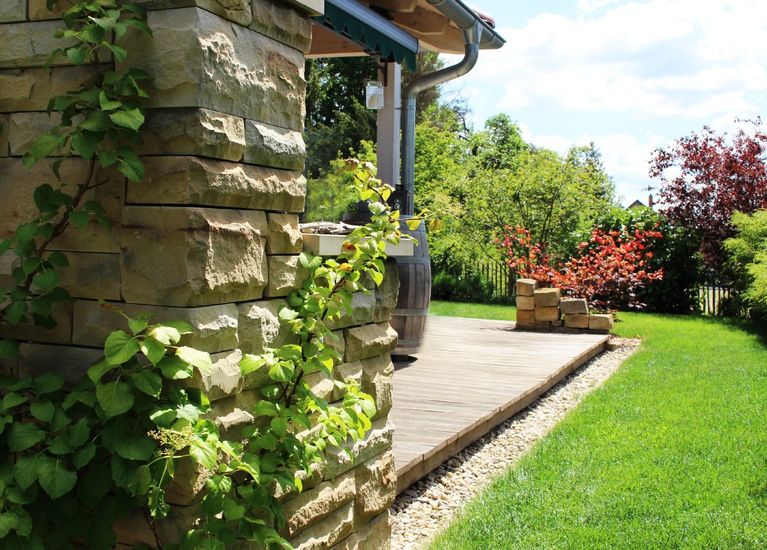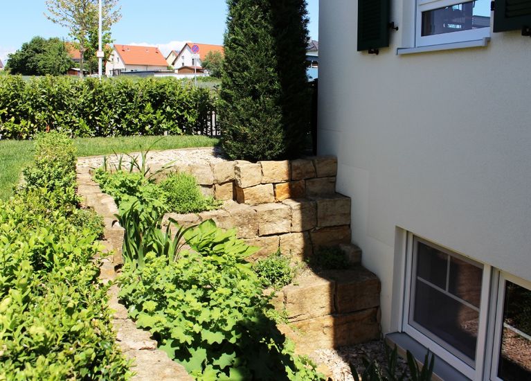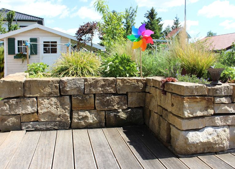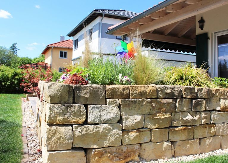 Gestaltung Privat­garten mit Naturstein­mauern in Bertels­dorf